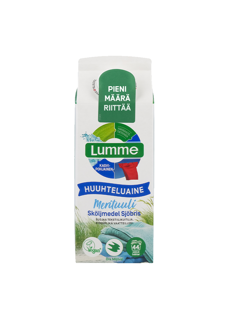 Lumme Huuhteluaine Merituuli on pakattu kierrätettävään kartonkipakkaukseen. Tuote on ympäristömerkitty Bra miljöval -merkillä ja sillä on Vegan-merkki. Pakkaus riittää 44 pesukertaan.