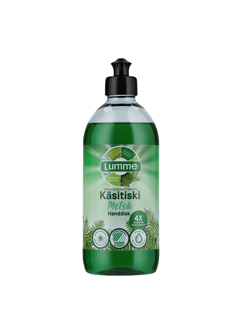 Ympäristömerkitty Lumme Käsitiskiaine puhdistaa tehokkaasti sitkeää likaa ja rasvaa, sekä jättää astiat kiiltävän puhtaiksi. Tuotteessa on ihana metsän tuoksu, joka poistaa tehokkaasti kalasta, valkosipulista ja ruokajäämistä tullutta pahaa hajua, sekä astioista että tiskirätistä. Riittoisa ja tehokas koostumus – 2 ml riittää 5 litraan vettä. Vegan Society -sertifioitu. Dermatologisesti testattu herkällä iholla. Pullo on 100 % kierrätysmuovia.